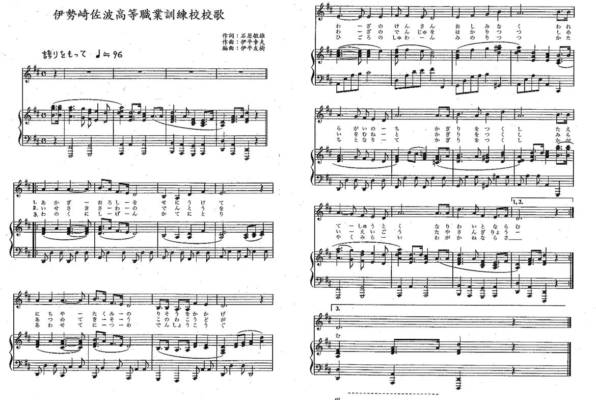 伊勢崎佐波高等職業訓練校 校歌 作詞:石原敏雄・作曲:伊平幸夫・編曲:伊平友樹 ↑クリックで校歌を再生します。音量に注意して下さい。(192kbps) 下記譜面をクリックするとPDFダウンロードが始まります。 << 前のページに戻る